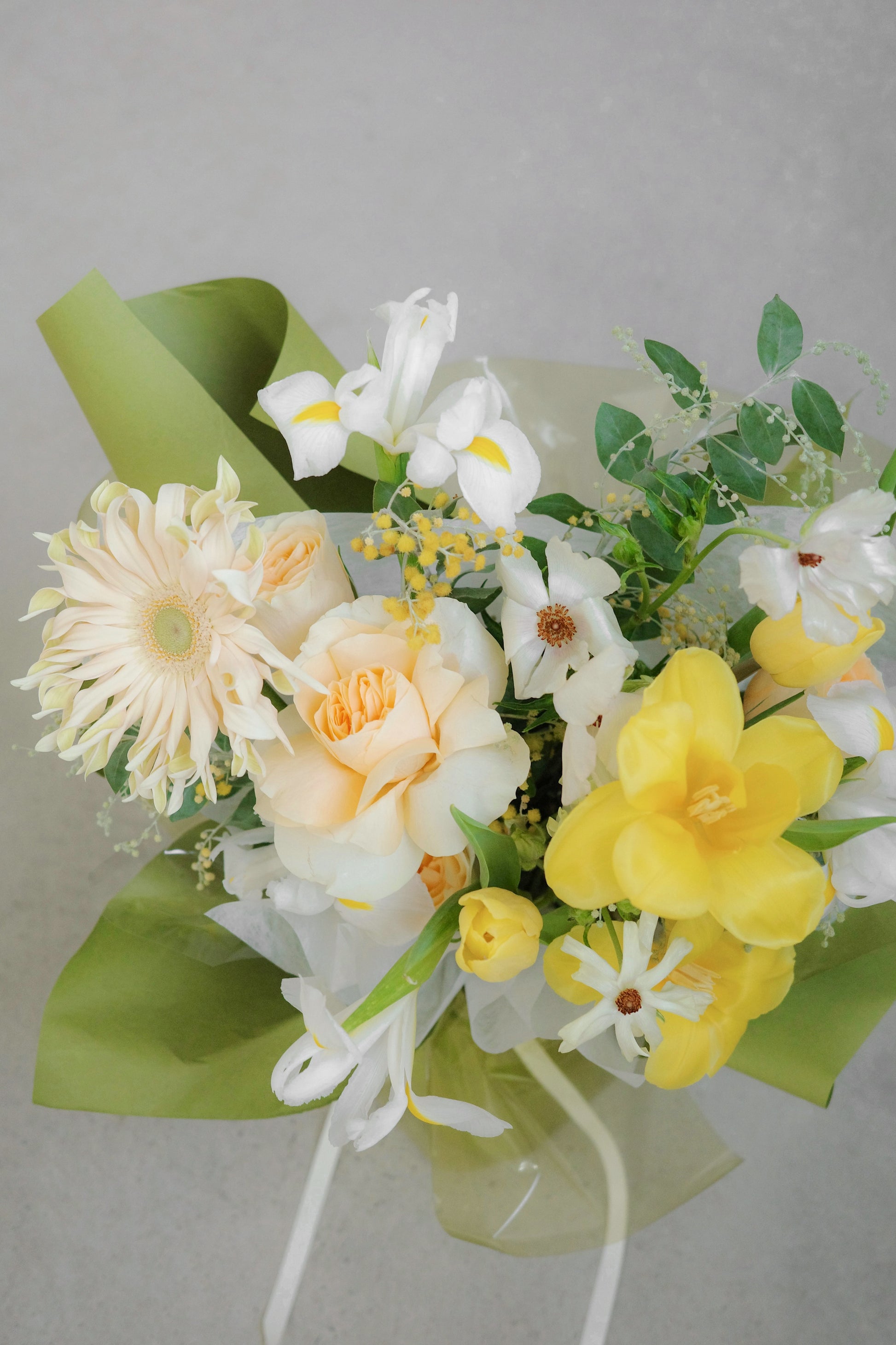A playful mix of white and yellow blooms, wrapped in a vibrant green colour with intentional folds to mimic pleats in a dress. Giving its name, Dressed in Green. Perfect for adding a pop of colour to any occasion, this lively arrangement is sure to bring a smile to anyone's face.
