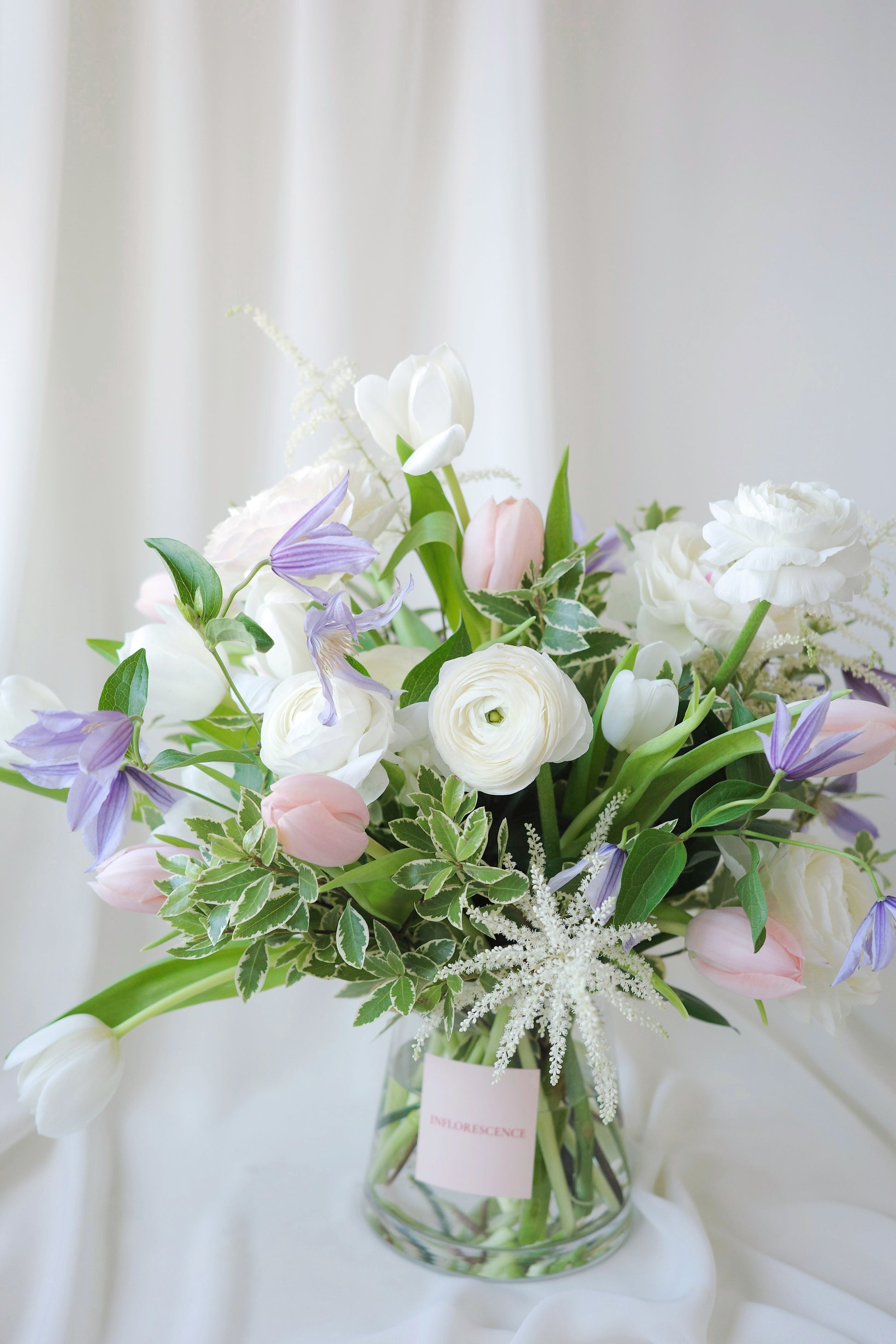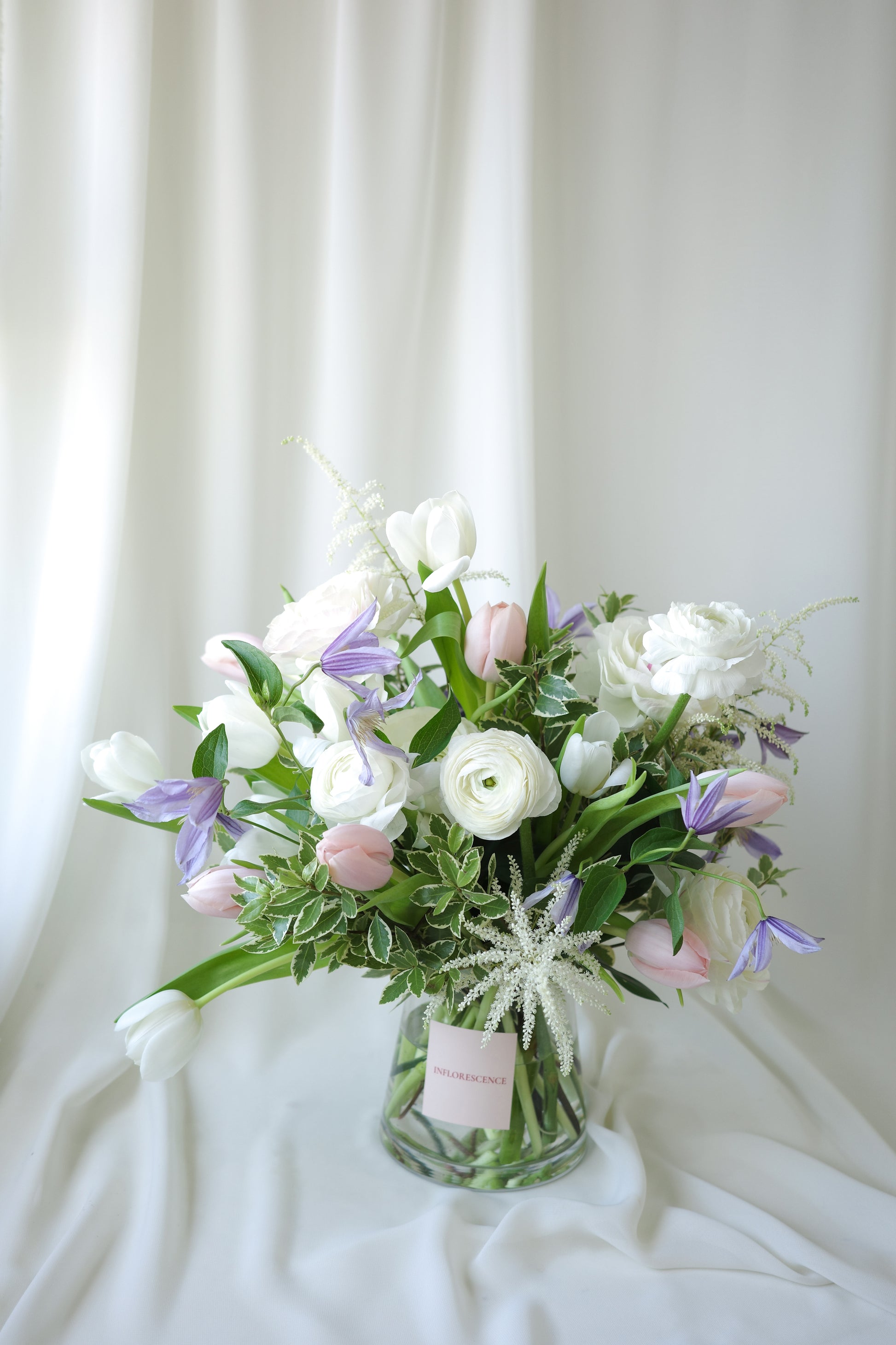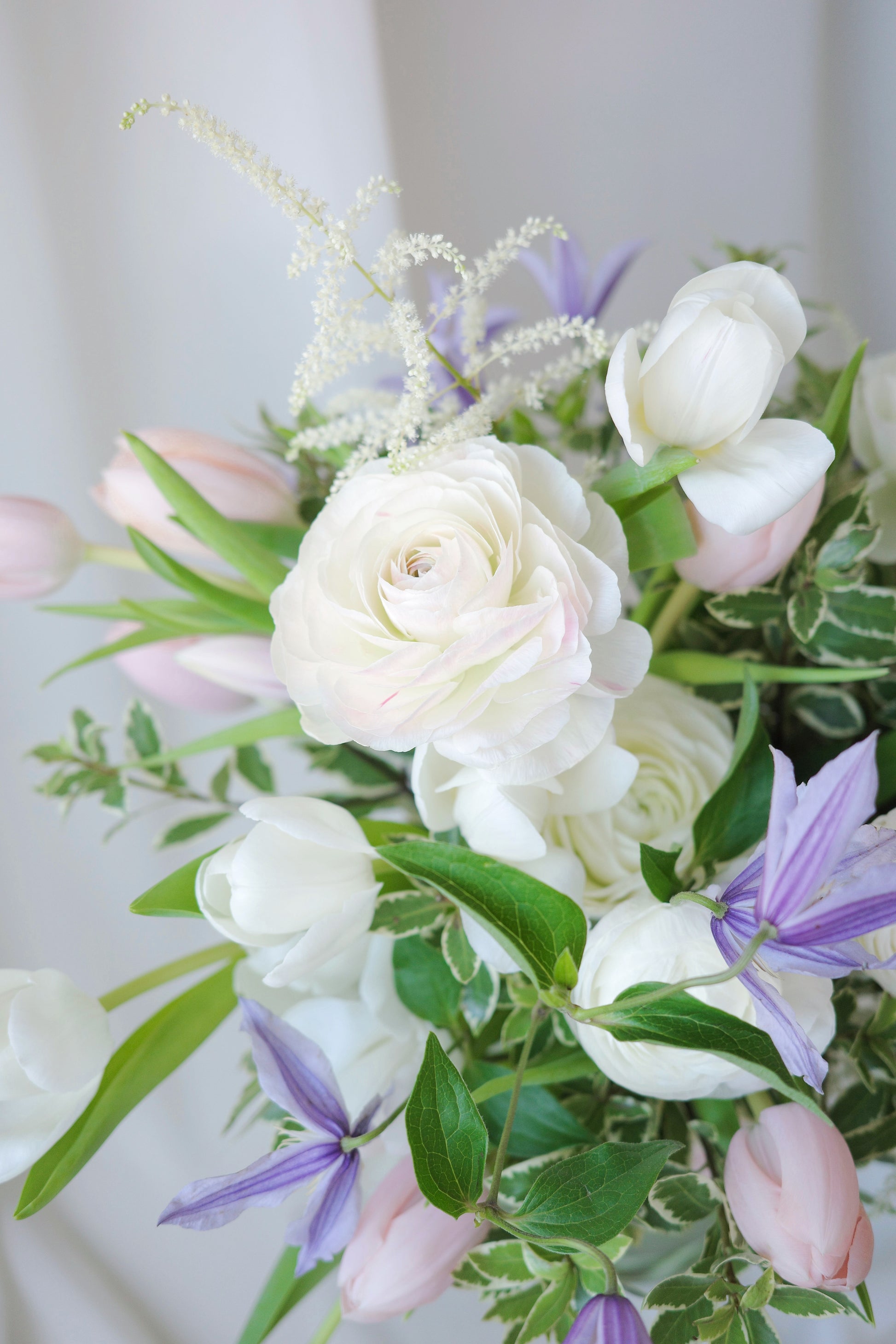 White tulips and ranunculus take center stage, their pristine petals exuding timeless grace and simplicity. Pops of clematis add a touch of whimsical charm, while peach tulips bring a subtle warmth, like the first blush of dawn. Together, they create an arrangement that feels both tender and uplifting, like a love letter written in soft ink.